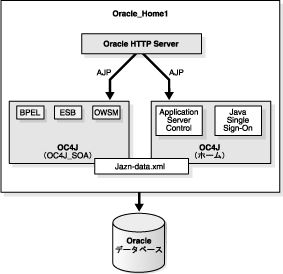 単一のOC4Jインスタンスを含む、1つのOracleホーム内に存在する1つの中間層。 |