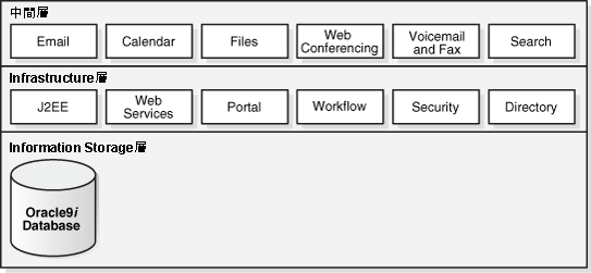 Infrastructure層は、Oracle9i Application Server上に構築されています。 この層は、セキュリティ、ディレクトリ、ポータル・サービスなどのサービスの共通セットで構成されています。 これらのサービスは、Oracle Collaboration Suiteアプリケーションによって使用されます。
