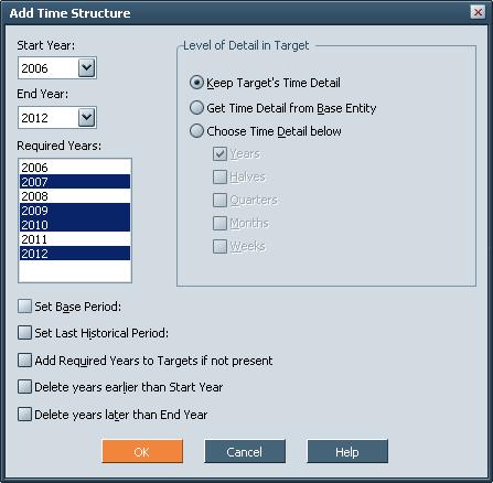 In Entity Change Manager, the Add Time Structure dialog box selects multiple years in the Required Years box.