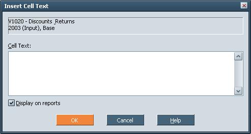 You use Cell Text to create notes on cells or accounts. Cell Text notes are specific to a selected cell-scenario or account-scenario combination. Notes are indicated by red tick marks in the upper-right corner of cells. Cell Text in reports.