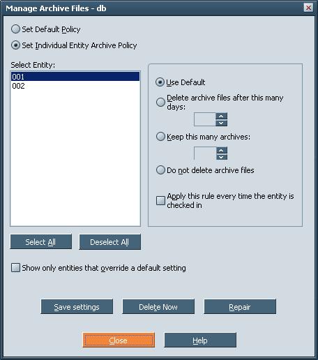 Automatic purge of entity archives enables an administrator to configure theOracle Hyperion Strategic Finance, Fusion Edition server to purge older archives stored on the server. On the Manage Archive Entity Files dialog box, the “Apply this rule every time the entity is checked in option” enables the automatic purging of entity archives according to the selected policy.