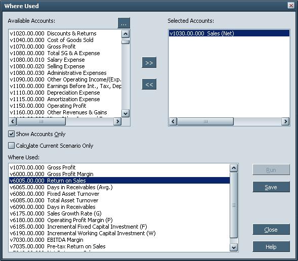 Where Used is a forward audit trail to help you understand the potential model modifications. You select accounts and calculate all scenarios, and Where Used tracks which other accounts use the selected accounts.