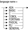 プログラムが記述されるホスト言語の名前を指定するキーワードです。このプログラムでは、モジュール内でプロシージャがコールされます。LANGUAGE句に対応するキーワードを持たない言語にGENERALを指定します。言語識別子により次が決まります。