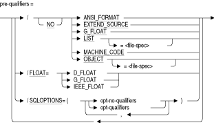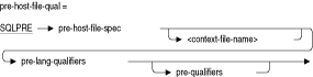 プリコンパイラを起動するためにどのような方法を選択する場合でも、SQLプリコンパイラによるモジュール・ファイルの処理方法を制御するための様々な修飾子を指定できます。構文図は、ホスト言語プログラム・ファイルの仕様とともに使用できる修飾子の形式を示しています。