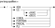 埋込みSQLプロシージャが含まれるプログラムが書き込まれるホスト言語を示します。言語修飾子を指定する必要があります。ホスト言語修飾子値は、ADA、CC、CC=VAXC、CC=DECC、COBOL、FORTRAN、PASCALおよびPLIです。CC SQLプリコンパイラ・スイッチについては、次の点に注意します。