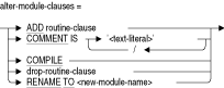 新規のファンクションおよびプロシージャをモジュールに追加できます。routine-clauseの詳細は、「CREATE MODULE文」を参照してください。ALTER MODULE句を終了し、文を明白に終了するには、END MODULE句を使用する必要があります。COMMENT IS 'string'