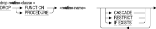 DROP FUNCTION句およびDROP PROCEDURE句は、このモジュールから名前付きルーチンを削除します。All DROP句は、このALTER文の中のCOMPILE句およびADD句の前に実行します。END MODULE