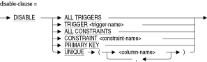 この表に対して指定されたトリガーが有効になります。指定されたトリガーは表で定義されている必要があります。- DISABLE ALL CONSTRAINTS