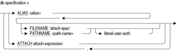有効な別名を1つ以上指定します。特定のデータベースを識別する別名は、そのデータベースが現在のアプリケーションのいずれかのモジュールで宣言されているか、ATTACH文によりアタッチされている場合にのみ有効です。ATTACH文は、db-specificationの一部として発行できます。FILENAME 'attach-spec'