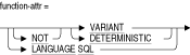 これらの句は、DETERMINISTIC句およびNOT DETERMINISTIC句と同義です。DETERMINISTIC句は、ファンクションに対する入力が同じであれば、出力も同じになることを示します。これはNOT VARIANT句と同義です。NOT DETERMINISTIC句は、ファンクションの出力は、その入力に依存しないことを示します。これはVARIANT句と同義です。この句は廃止予定です。かわりにDETERMINISTICを使用してください。この句は、問合せの有効範囲内で外部ファンクションの評価を制御します。