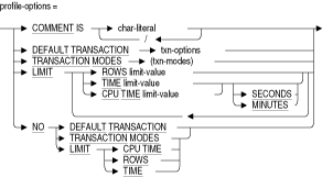 SQL> CREATE PROFILE DECISION_SUPPORT cont> COMMENT IS 'limit transactions used by report writers' cont> TRANSACTION MODES (NO READ WRITE, READ ONLY);