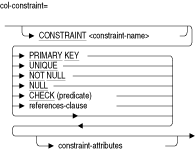 CONSTRAINT句はオプションです。制約名を省略すると、SQLにより名前が作成されます。ただし、Oracle Rdbでは、列制約および表制約に常に名前を付けることをお薦めします。CONSTRAINT句を使用して制約名を指定する場合、マルチスキーマ・データベースを使用しているときは、その名前はデータベース内またはスキーマ内で一意である必要があります。