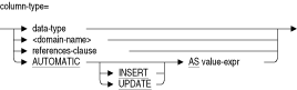 AUTOMATIC INSERT列を定義して、挿入操作時に自動的にデータを受信できます。データは他の列と同様に格納されますが、列は読取り専用です。AUTOMATIC列は読取り専用列として処理されるため、挿入操作用の列リストには表示されず、更新操作によっても変更されません。AUTOMATIC UPDATE列には、行が挿入されるときに使用される関連付けられたデフォルト値を格納できます。「例」の項の「例15」を参照してください。