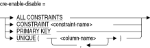 次のリストで説明する、全制約、指定した制約、主キー、または一意の列名を有効または無効にできます。デフォルトでは、表作成の操作時に追加された表制約および列制約は有効になっています。
