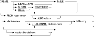 CREATE TABLE文のFROM path-name形式を使用する場合は、DATATRIEVEフォーマット句など、制約や他の表定義句は定義できません。この制限によって、後でALTER TABLE文を使用してそれを追加できないということはありません。
