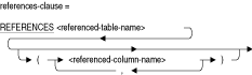 一意キーまたは主キーの列名、または被参照表の列名を指定します。表制約としてREFERENCES句が使用される場合は、FOREIGN KEY句で指定される列名が参照表の外部キーになります。列タイプ句として使用する場合は、列のタイプは参照されるPRIMARY KEY索引またはUNIQUE索引から継承されるよう指定します。データ型とドメインの両方が継承されます。