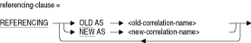 UPDATE操作によって適用される新規行値を参照するために使用する一時名です。FOR EACH ROW句を指定しない場合、この相関名はトリガー文で参照できません。referencing-clause