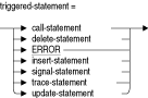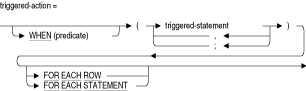 1つのオプション条件、複数のトリガー文、およびオプションの頻度句で構成されています。指定し場合、トリガー・アクション句のトリガー文を実行するには、この条件がTRUEと評価される必要があります。各トリガー文は、トリガー・アクション句に記述されている順序で実行されます。triggered-statement