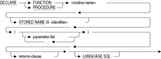 データベース定義文で使用するルーチン・インタフェースを宣言します。ルーチンはファンクションかプロシージャのいずれかです。宣言されたルーチンは、CREATE TABLE文、CREATE VIEW文およびCREATE MODULE文などのDDL文のファンクションまたはプロシージャに対するコールのテンプレートとして動作します。テンプレートによってRdbは、ルーチンに正しく名前が付けられており、正しい数のパラメータが渡されており、さらにそのパラメータに互換性のある引数が渡されていることが検証できます。ファンクションでは、返されたデータ型を使用して、COMPUTED BY、AUTOMATICおよびその他の格納された値式のデータ型を計算します。