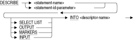 DESCRIBE文は、プログラムが使用する情報をSQLがSQLDAに書き込む方法を指定します。具体的には、DESCRIBE文は、準備された文の選択リスト項目またはパラメータ・マーカーの、数とデータ型をSQLDAに格納します。