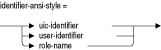 ロールの名前です。CREATE ROLE文で作成されたロール名などが該当します。オペレーティング・システムのグループまたは権利の識別子としてロール名が存在する場合、Oracle RdbではGRANT文の発行時にロールが自動的に作成されます。自動的に作成されるロールは、常にIDENTIFIED EXTERNALLYの属性を持ちます。TO identifier-ansi-style