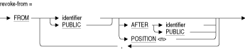 ACL内のエントリの位置を指定します。AFTER引数またはPOSITION引数を省略すると、SQLは、ACL全体で、REVOKE文のFROM句で指定された識別子リストと一致する識別子リストを検索します。一致対象が見つかると、SQLは、権限リストで指定された権限を削除して、ACLエントリを変更します。一致対象がない場合、SQLはエラーを生成し、REVOKE文はACLに影響しません。AFTER引数またはPOSITION引数を使用すると、リスト内の位置を指定できます。SQLはこの位置を起点として、REVOKE文のFROM句で指定された識別子と一致する識別子を含むACLエントリを検索します。