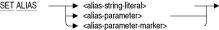 動的SQL文でパラメータ・マーカー(?)を指定します。別名のパラメータ・マーカーは、デフォルトの別名を指定するパラメータを参照します。alias-string-literal