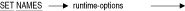 - SET NAMES文により、明示的なデータベースのコンテキストを持たない文のSQLDAおよびSQLDA2にあるSQLNAMEフィールドのキャラクタ・セットも指定されます。
