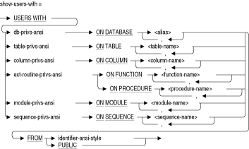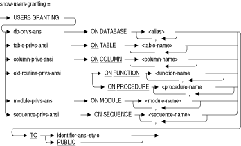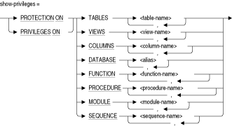 SHOW PRIVILEGES文またはSHOW PROTECTION文を使用してアクセス権限セットの情報を表示するオブジェクトを指定します。名前のリストを指定できますが、リストを表示するには少なくとも1つの項目を指定する必要があります。少なくとも関連表名を使用して列名を修飾する必要があります。ANSI/ISOスタイルのデータベースでは、SHOW PROTECTION文により、他のユーザーに付与するオプションがある権限と付与オプションがない権限を表示します。他のユーザーに直接的または間接的に付与される権限の表示の詳細は、この項のSHOW USERS WITH文およびSHOW USERS GRANTING文を参照してください。
