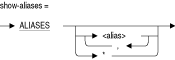 先頭にオプションの別名が付くアスタリスクのワイルドカードを指定します。ワイルドカードの先頭に別名を付けない場合、デフォルト・データベース内のオブジェクトに関する情報が表示されます。ワイルドカードの先頭に別名を付ける場合、そのデータベース内のオブジェクトに関する情報が表示されます。ALIASES