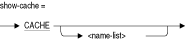 SQL> SHOW CACHE Cache Objects in database with filename sample CACHE1 CACHE2 SQL> SHOW CACHE cache1 CACHE1 Cache Size: 1000 rows Row Length: 256 bytes Row Replacement: Enabled Shared Memory: Process Large Memory: Disabled Window Count: 100 Reserved Rows: 20 Sweep Rows: 3000 No Sweep Thresholds Allocation: 100 blocks Extent: 100 blocks