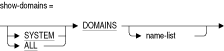 SET DISPLAY、SET FEEDBACK、SET HEADING、SET LINE LENGTH、SET PAGE LENGTHおよびSET NULLを使用して確立された現在の設定を表示します。一部の値(行やページ長など)は、対話型SQLの起動時にOpenVMSのターミナル特性から確認されます。DOMAINS