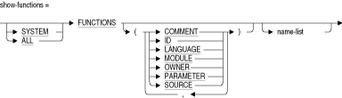 指定したファンクション(外部ファンクションまたはストアド・ファンクション)に関する情報を表示します。引数なしでSHOW FUNCTIONS文を入力すると、そのファンクションの名前のみが表示されます。次の表では、SHOW FUNCTIONS文で一連のキーワードを使用して表示できる情報をリストしています。