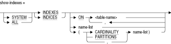 指定した索引に関する情報を表示します。索引名、関連する列と表、索引キーのサイズ、列値の重複の定義上の可否、索引タイプ(ソートまたはハッシュ)、および索引圧縮の有効化の有無が表示されます。引数なしでSHOW INDEXES文を指定した場合、宣言されたすべてのデータベース内のすべての索引の定義が表示されます。