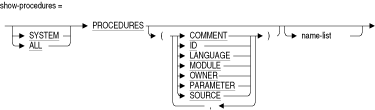 指定したプロシージャ(外部プロシージャまたはストアド・プロシージャ)に関する情報を表示します。SHOW PROCEDURES属性(COMMENT、ID、LANGUAGE、MODULE、OWNER、SOURCEまたはPARAMETER)を指定しない場合、デフォルトでは、これらすべてのオプションが表示されます。