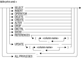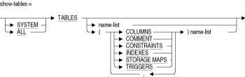 SHOW PRIVILEGES文またはSHOW PROTECTION文を使用してアクセス権限セットの情報を表示するデータベースを指定します。別名のリストを指定できますが、少なくとも1つの別名を指定する必要があります。デフォルト・データベースの権限を表示するには、別名RDB$DBHANDLEを使用します。ON TABLES table-name