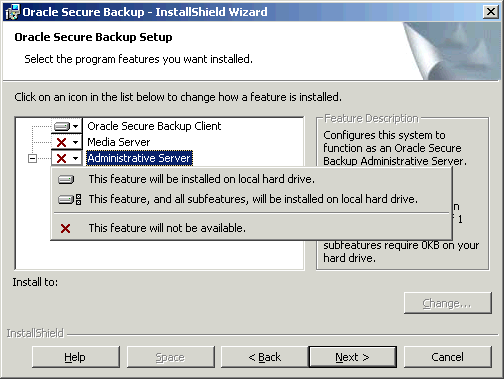 「この機能は、ローカル・ハード・ドライブにインストールされます。」を選択します。このオプションを選択すると、管理サーバー・アイコンからXが削除され、インストールに管理サーバーが含まれます。