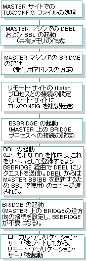 注記 tmboot オプションの総合一覧については、tmboot(1)のリファレンス・ページを参照してください。 小規模アプリケーション (マシン 2 台による構成) で tmboot を実行する コンフィギュレーション全体を起動するには、次のコマンドを入力します。 tmboot を実行すると、次の処理が実行されます。 小規模アプリケーションの起動手順 (デフォルト)prompt> tmboot -y