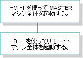 大規模アプリケーション (50 台を超えるマシン構成) で tmboot を実行する 大規模アプリケーション (50 台を超えるマシン構成) の場合は、1 つのステップですべてのマシンを起動します。前に述べたデフォルト手順 (マシン 2 台の構成の場合) のすべてのステップは実行しません。次の図は、最適化された起動手順を示しています。 大規模アプリケーションの起動手順