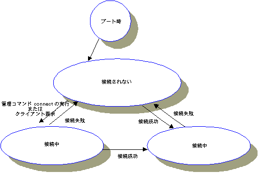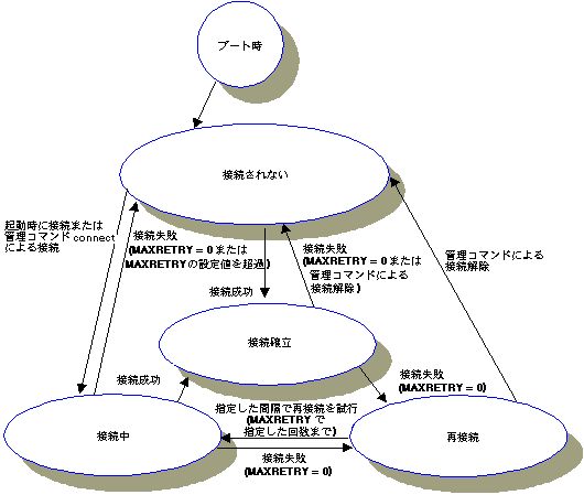 MAXRETRY パラメータは、接続方針が ON_STARTUP の場合のみ有効です。それ以外の接続方針 (ON_DEMAND および INCOMING_ONLY) では、再接続は行われません。