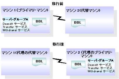グループ内のすべてのサーバを非アクティブにしたら、代理のプライマリ・マシンから代理の代替マシンにグループを移行できます。実行中のサーバ、現在宣言されているサービス、および動的に変更されたコンフィギュレーション内容を指定する必要はありません。設定済みの代替マシンは、設定済みのプライマリ・マシン上で利用可能なサーバ (非アクティブの場合) のコンフィギュレーション情報から、これらの情報を取得します。使用されているデータ依存型ルーティングが代替マシンでも適用される場合、サービスは、ルーティング先のグループ名 (マシン名ではない) に基づいてルーティングされます。 移行の対象がアプリケーションの一部であっても、全体であっても、サービスの中断を最小限に抑えるように変更処理を行ってください。アプリケーションのマシン、ネットワーク、データベース、およびその他のコンポーネントの整合性は、そのままにしておく必要があります。BEA Tuxedo システムにはアプリケーションの移行時に、すべてのコンポーネントの整合性を保持するための方法が用意されています。