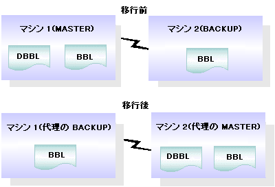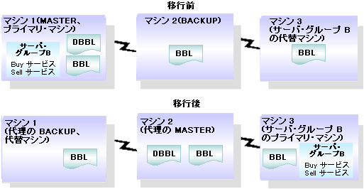 Master マシンの移行とは、設定済みの MASTER マシンから設定済みの BACKUP マシンに DBBL を移動するプロセスのことです。このプロセスにより、設定済みの MASTER マシンがダウンしていても、サーバは引き続きサービスを提供することができます。移行を行うには、まず、設定済みの BACKUP マシンを代理の MASTER マシンとし、設定済みの MASTER マシンを代理の BACKUP マシンとするよう、管理者側から要求します。これで、すべての管理機能は、代理の MASTER マシンで行われます。つまり、コンフィギュレーション内のほかのマシンを監視し、コンフィギュレーションの動的な変更を受け付けます。