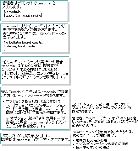 tmadmin コマンドは、掲示板とその関連エンティティを表示したり、変更するための 53 種類のコマンドのインタプリタです。次の図は、典型的な tmadmin セッションの動作の例です。