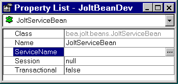 プロパティ・エディタは、リポジトリからキャッシュされた情報を読み取り、使用可能なサービス名とリストボックスのデータ要素を返します。ServiceName のプロパティ・エディタの例を次の図の「JoltServiceBean のプロパティ・エディタ」に示します。 Bean のプロパティを追加するには、以下の手順に従います。