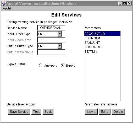 Jolt リポジトリは、Java パラメータを BEA Tuxedo の型付きバッファに変換するために Jolt 内部で使用されます。リポジトリ・エディタはダウンロード可能な Java アプレットとして利用できます。BEA Tuxedo サービスをリポジトリに追加する場合は、Jolt サーバにエクスポートして、Jolt クライアントからクライアント・リクエストを発行できるようにする必要があります。
