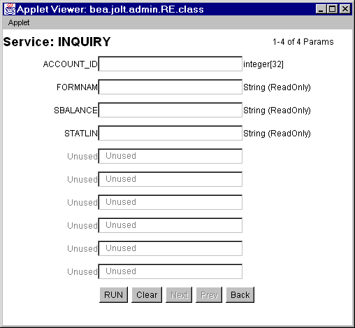 パラメータ情報が正確かどうかを確認するため、[Run] ボタンを使ってサービスをテストします。サービスのテストは、テスト対象のサービスがある BEA Tuxedo サーバが実行されている場合にのみ可能です。