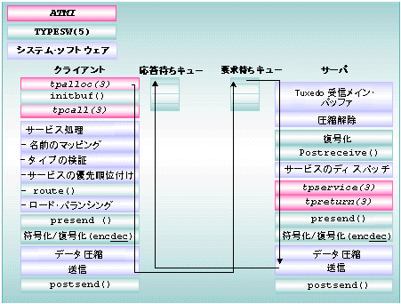 BEA Tuxedo ATMI 環境内のすべての通信は、メッセージを転送することによって行われます。BEA Tuxedo ATMI 環境では、オペレーティング・システムのプロセス間通信 (IPC) メッセージ・キューを使用して、クライアントとサーバ間でサービス要求のメッセージをやり取りします。システムのメッセージとデータは、バッファに格納され、クライアントとサーバのキュー間でやり取りされます。これは、オペレーティング・システムでサポートされたメモリ・ベースのキューです。BEA Tuxedo ATMI 環境では、メッセージは型付きバッファにパッケージ化されます。このバッファには、メッセージ・データと、送信されたメッセージ・データのタイプを識別するデータが格納されます。