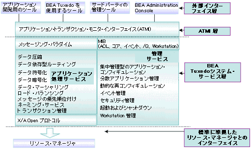 次の図は、BEA Tuxedo ATMI 環境を構成する基本的な要素を示しています。BEA Tuxedo は、システムへの外部インターフェイス、ATMI 層、MIB、BEA Tuxedo システムの各サービス、および標準に準拠したリソース・マネージャとのインターフェイスから構成されます。
