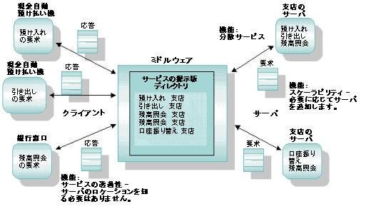 この銀行業務のサンプル・アプリケーションでは、クライアント (現金自動預け払い機および銀行窓口) が要求を行い、(支店の) サーバがサービスと応答を提供します。たとえば、ある顧客が、現金自動預け払い機を使って自分の当座預金の残高を調べるとします。現金自動預け払い機 (クライアント) は、残高を取得するためにサーバを呼び出します。サーバは要求を受信し、残高を取得し、その情報を現金自動預け払い機に送信します。