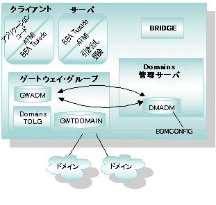 マルチ・ドメイン・コンフィギュレーションを構築するには、既存の BEA Tuxedo アプリケーションをほかのドメインと統合する必要があります。ドメイン間の相互運用性を確認し、すべてのドメイン上のサービスへのアクセスを維持し、すべてのドメインからのサービス要求を受け付ける必要があります。これらの機能は、すべてのドメインに送信されるサービス要求と、すべてのドメインから応答されるサービス要求を処理する高度な非同期マルチタスク・ゲートウェイによって実現されます。このゲートウェイを使用するには、ドメイン・ゲートウェイ・グループとゲートウェイ・サーバ用のエントリを TUXCONFIG ファイルに追加する必要があります。次の図は、BEA Tuxedo システムによって提供されるマルチ・ドメイン・コンフィギュレーションの設定と管理を行うツールを示しています。